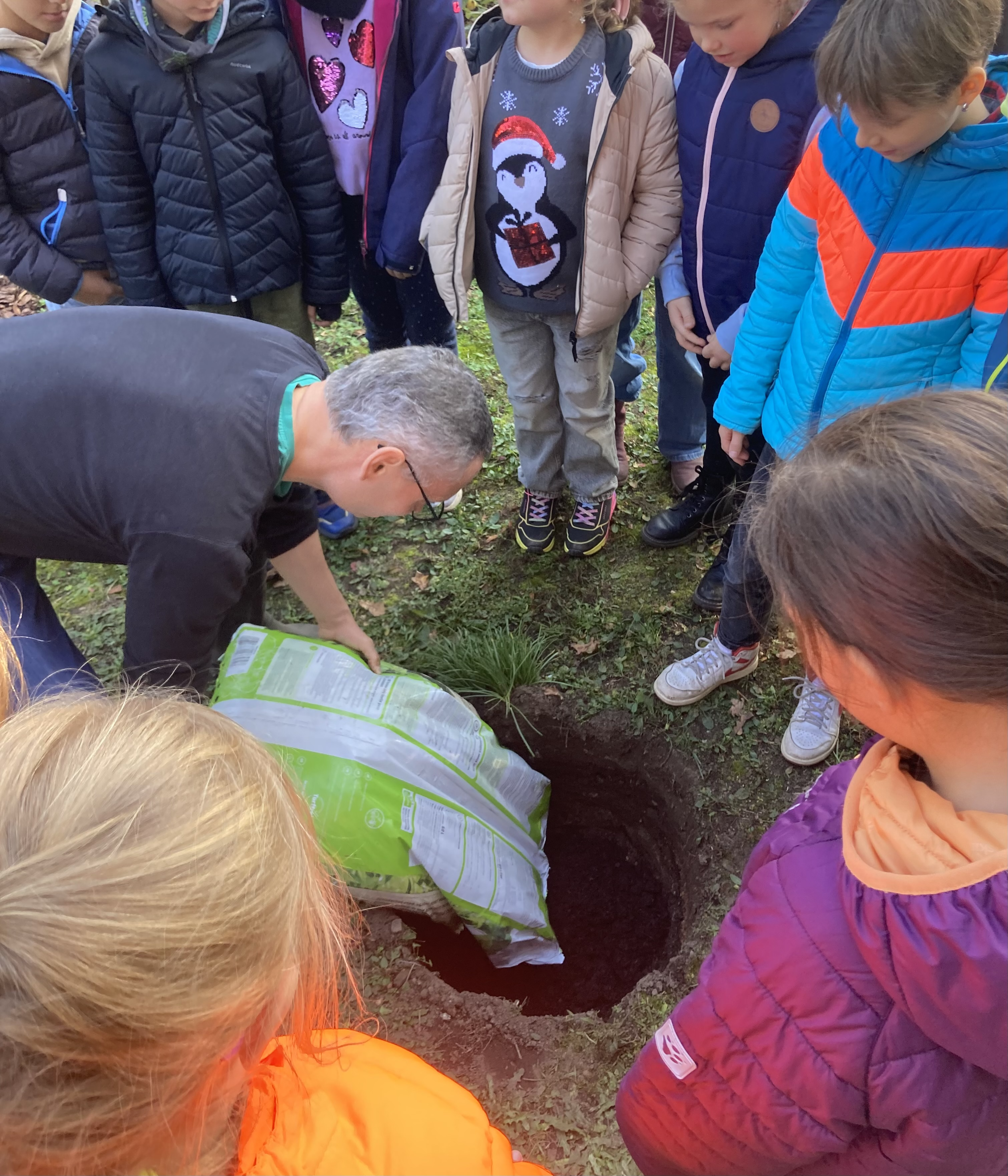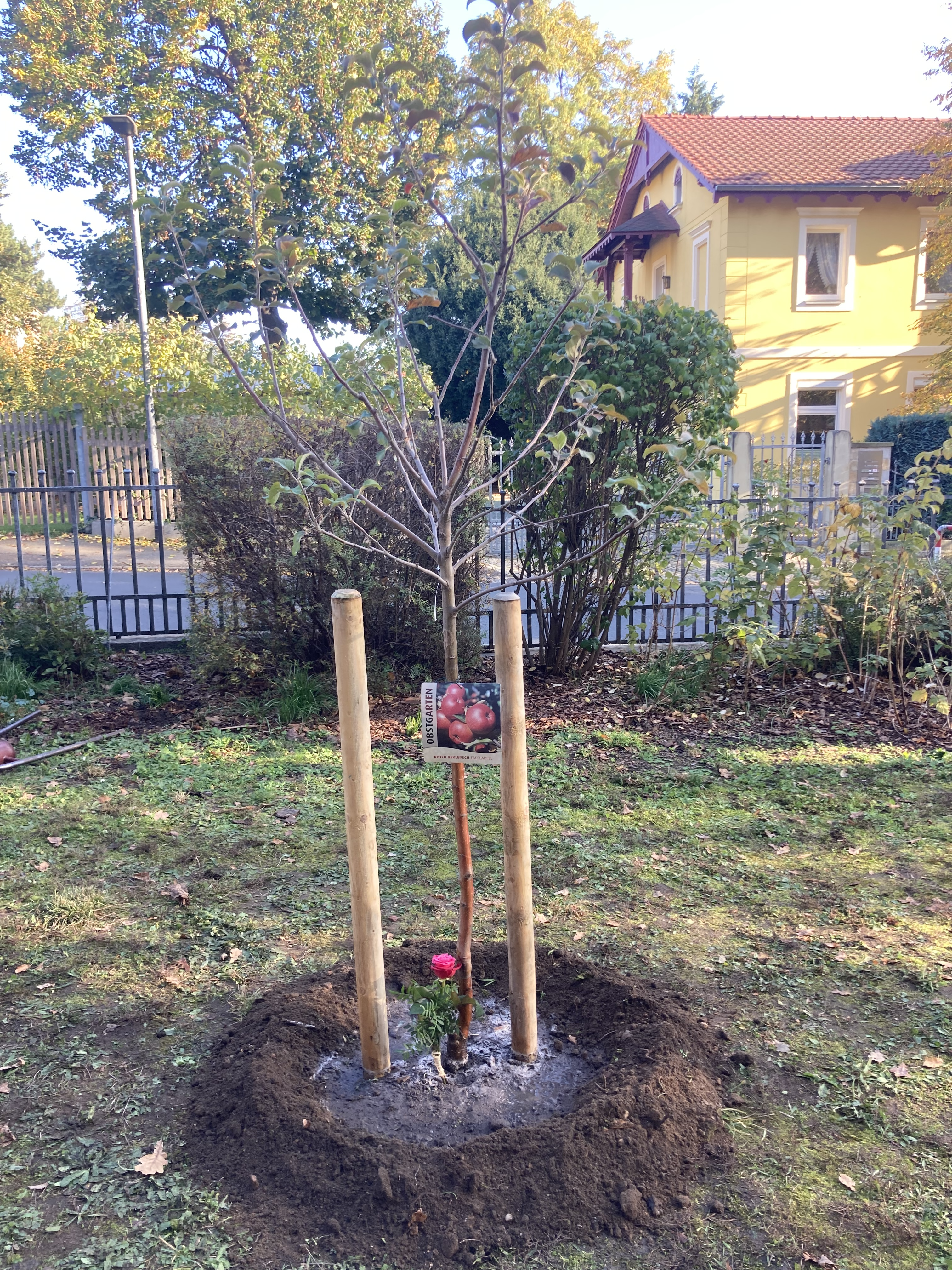 Die Klasse 3c hat ein Apfelbäumchen gepflanzt, um an ihren kürzlich