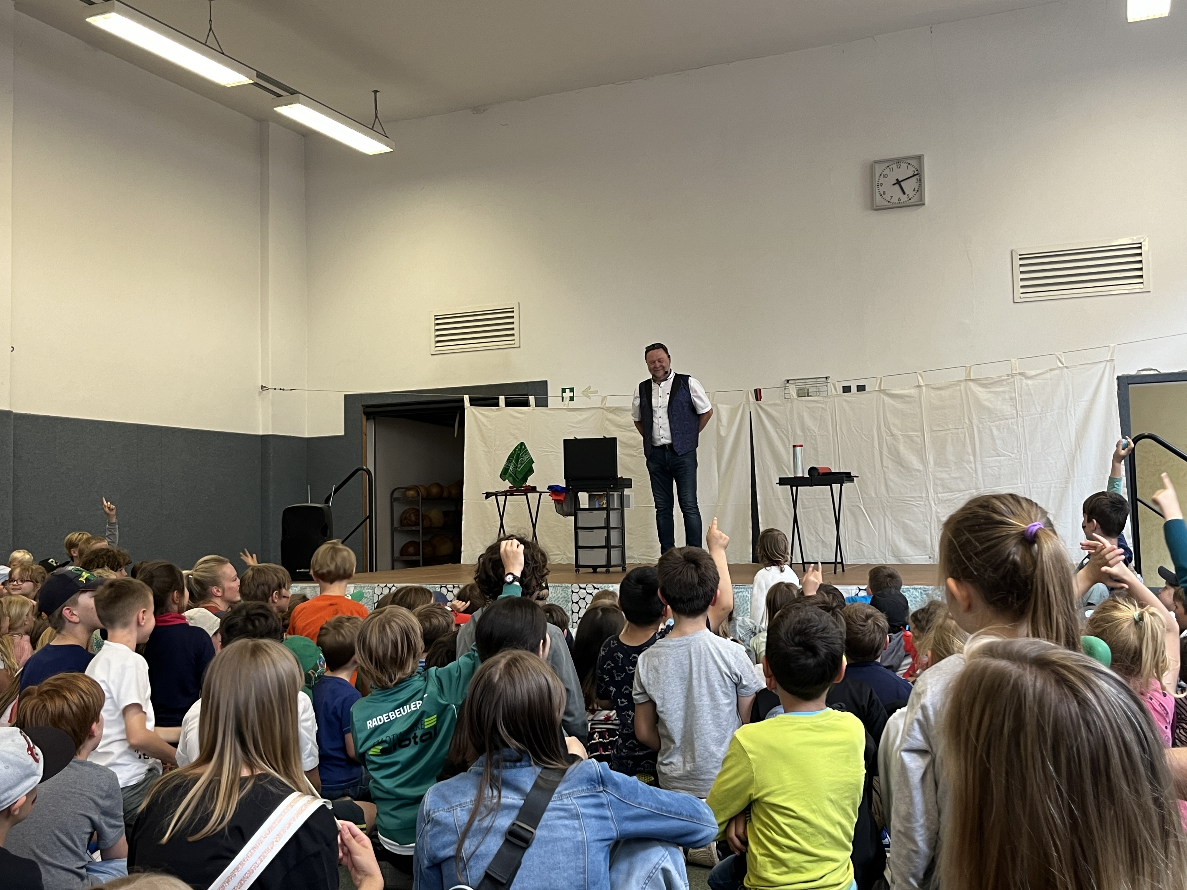 Den krönenden Abschluss des Sommerfestes bildete die Zaubershow in der Turnhalle. Mit magischen Illusionen und Tricks verzauberte der Magier die Kinder als auch die Erwachsenen. Trotz genauem Hinsehen konnte man seine Zaubertricks nicht so leicht entlarven.